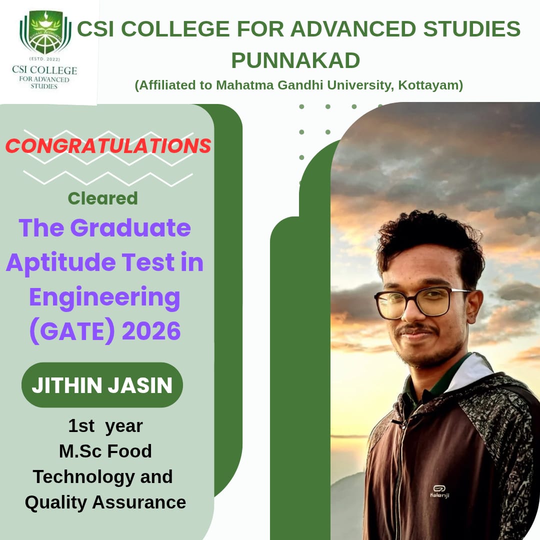 Cleared The Graduate Aptitude Test in Engineering (GATE) 2026, JITHIN JASIN 1st year M.Sc Food Technology and Quality Assurance