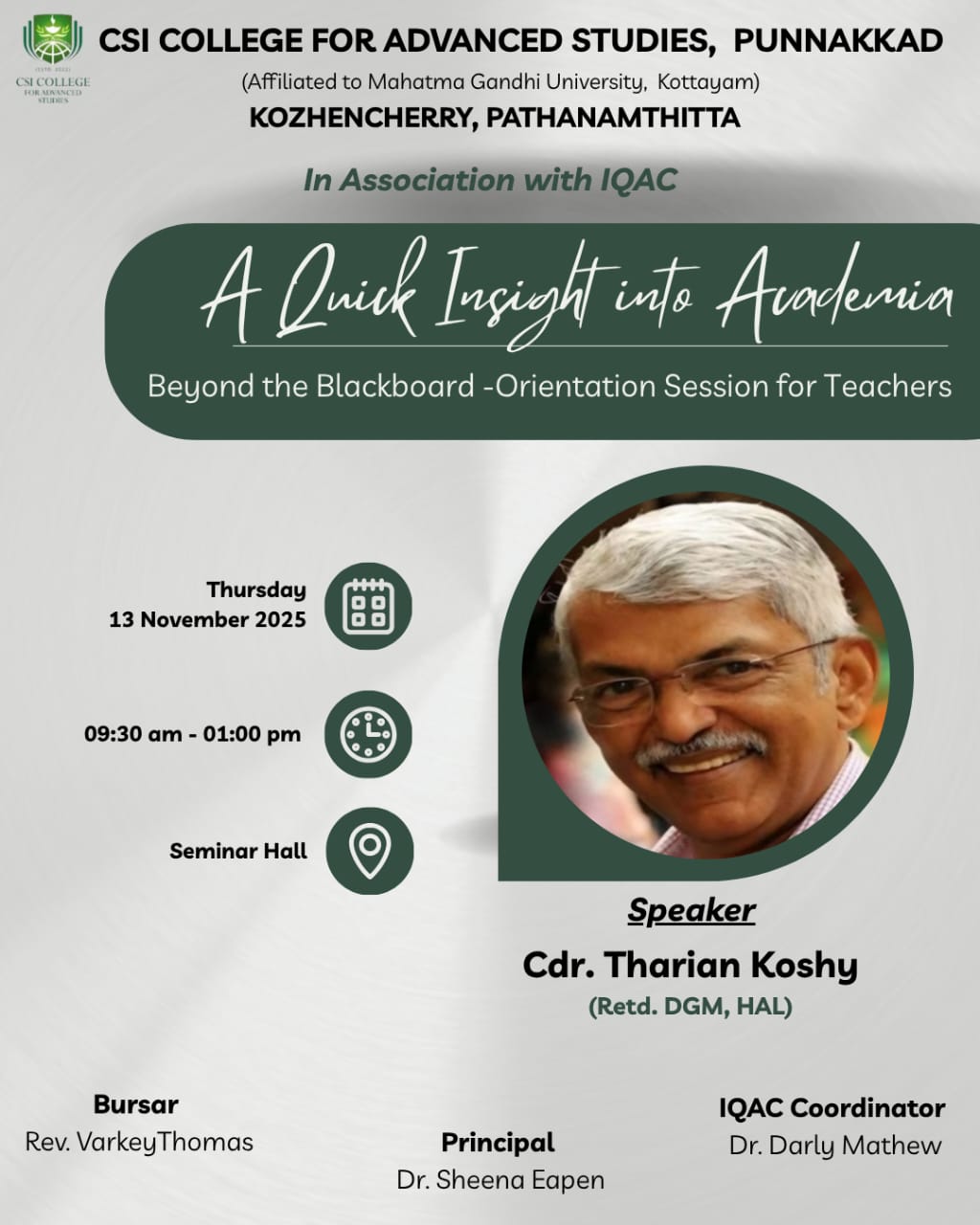 പുന്നയ്ക്കാട് സി എസ് ഐ കോളേജ് പുതിയ സെമസ്റ്റർ ആരംഭിക്കുന്നതിന് മുന്നോടിയായി 13-11-25 വ്യാഴാഴ്ച അധ്യാപകർക്ക് ഓറിയൻറേഷൻ ക്ലാസ്സ് നടത്തപെട്ടു.അധ്യാപനം ഒരു ഉൾക്കാഴ്ച എന്ന വിഷയത്തിൽ എച്ച് എ എൽ മുൻ ഡെപ്യൂട്ടി ജനറൽ മാനേജറും സ്കിൽ ട്രെയിനറുമായ കമാൻഡർ തര്യൻ കോശി അധ്യാപകർക്കുള്ള ക്ലാസ്സുകൾ നയിച്ചു.