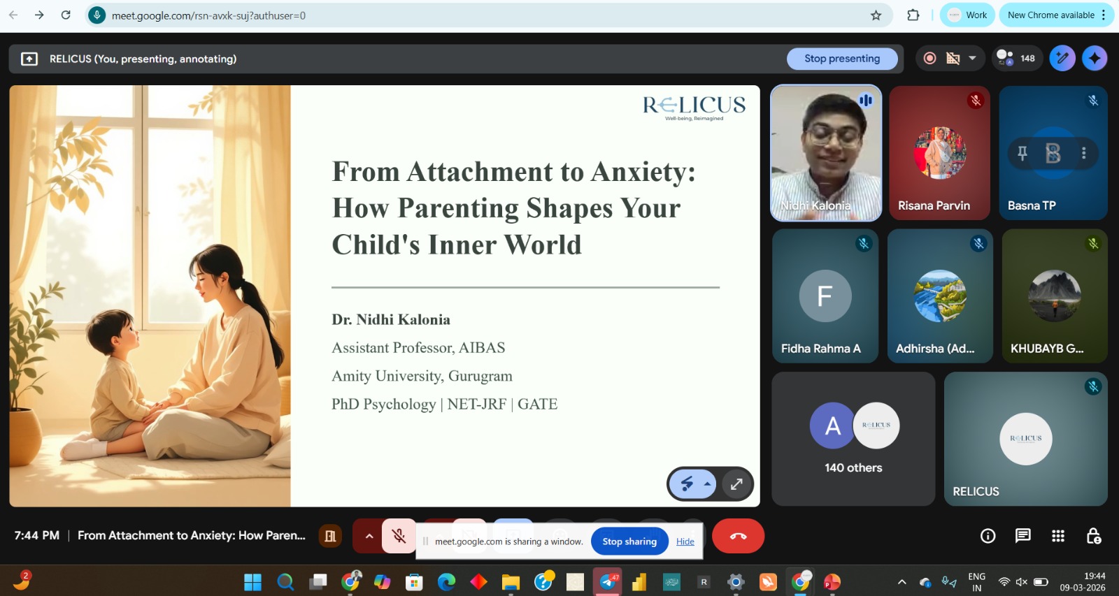 The session was led by Dr. Nidhi Kalonia, Assistant Professor at Amity Institute of Behavioural and Allied Sciences, Amity University, Haryana. The webinar provided valuable insights into how early parent–child relationships influence emotional security, confidence, and the risk of anxiety in children.
